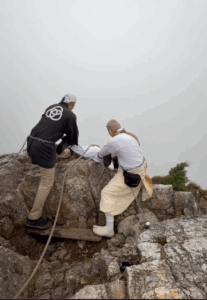 命綱一本を信じて、断崖絶壁の上から上半身を乗り出し、不浄を払って生まれ変わりを願う修行です。
